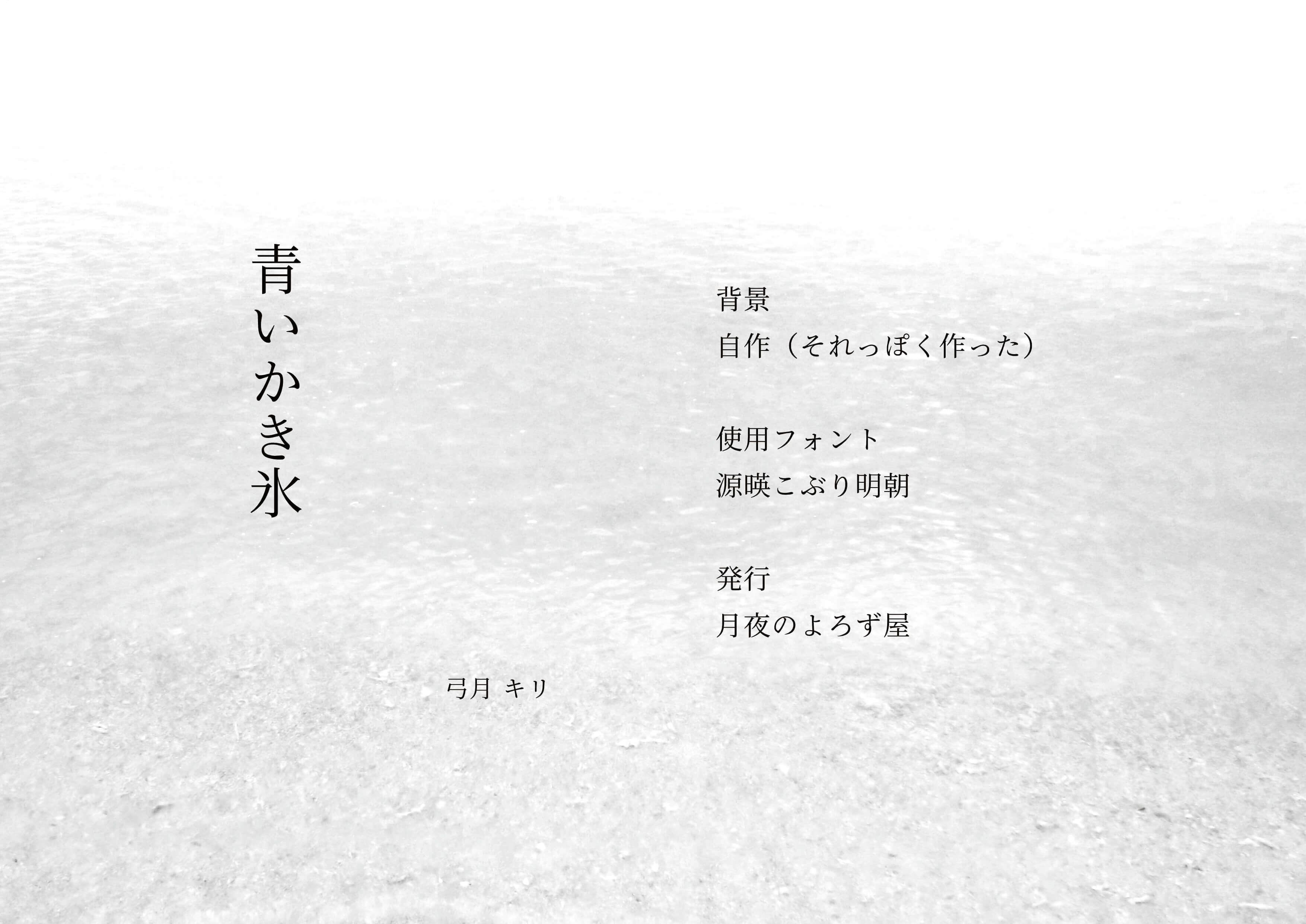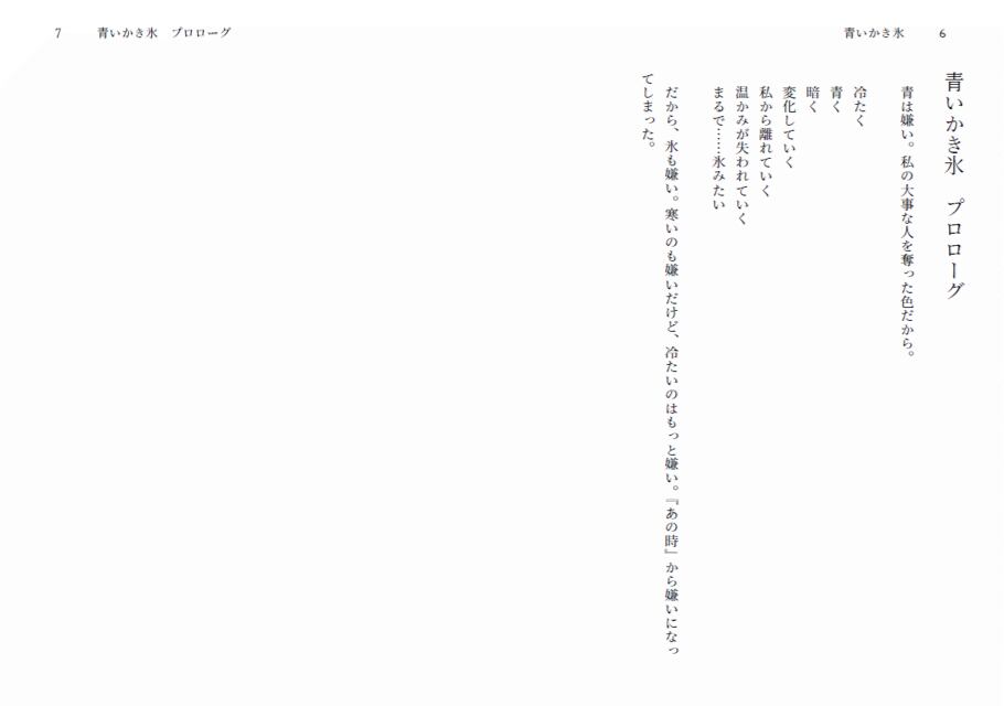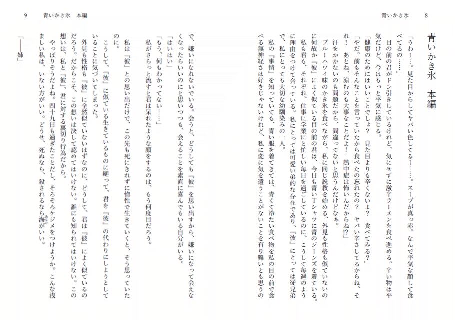 ある理由で青くて冷たいものが嫌いになってしまった女性と、女性の目の前で、青くて冷たいブルーハワイ味のかき氷を食べる少年の物語です。この二人の関係と女性が青くて冷たいものが嫌いになってしまった理由とは何か。しんみりとしたシリアス風味なお話です。